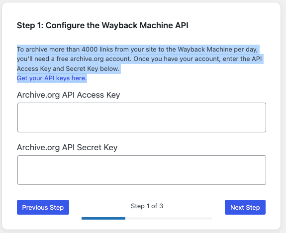The plugin is free, you do need a free account on the Internet Archive and obtain API keys to connect your site to the Internet Archive, on step 2 and 3 you’ll have to make some addtional decision.
